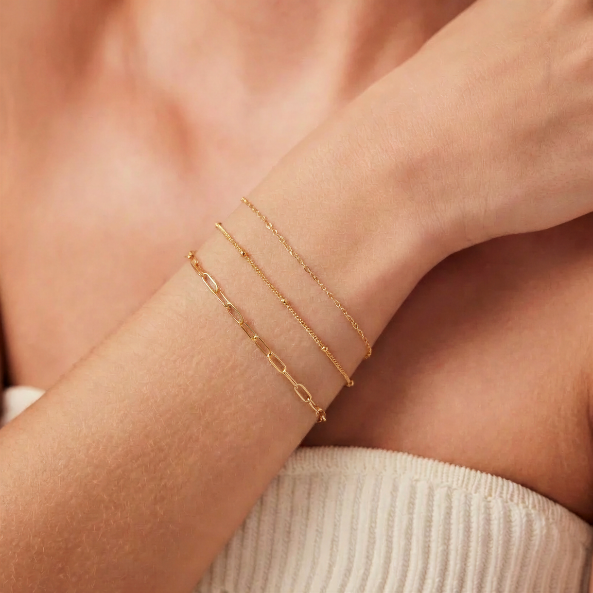 Conçus en acier inoxydable résistant à l’eau, nos bracelets ne s’oxydent pas et conservent leur éclat au fil du temps. Disponibles en or, or rose et argent, ils s’adaptent à toutes vos tenues et se marient parfaitement avec nos bagues, boucles d’oreilles, chaines et colliers. Envie d’un bijou unique ?