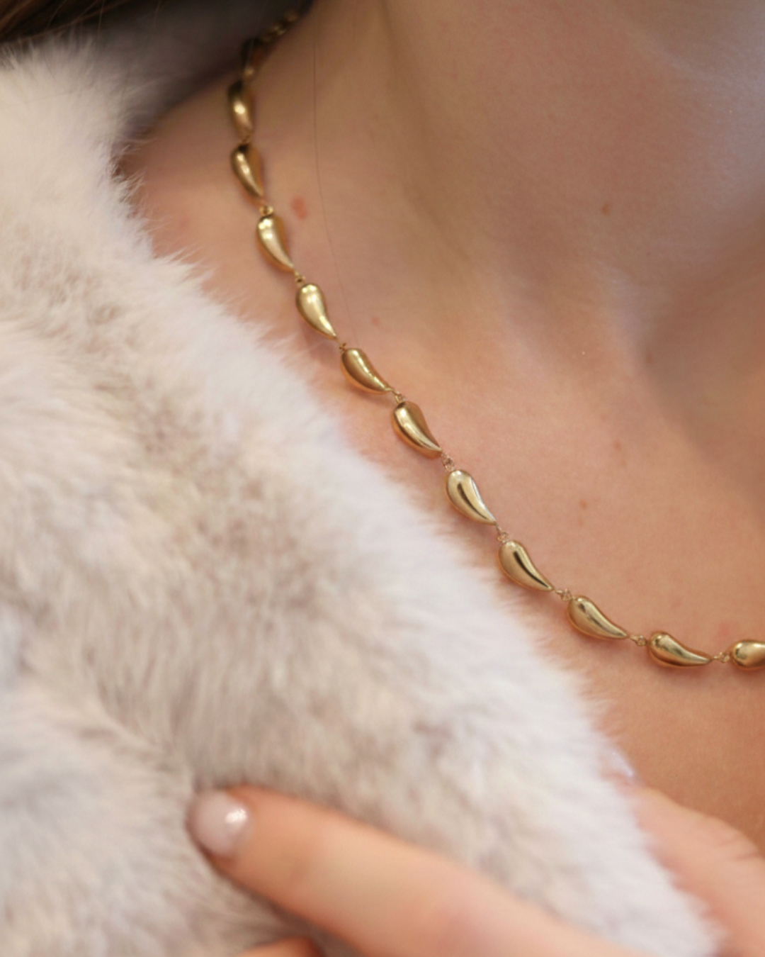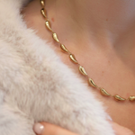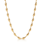 Un collier composé de maillons lisses en forme de goutte, créant une silhouette organique et fluide au charme sculptural.