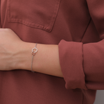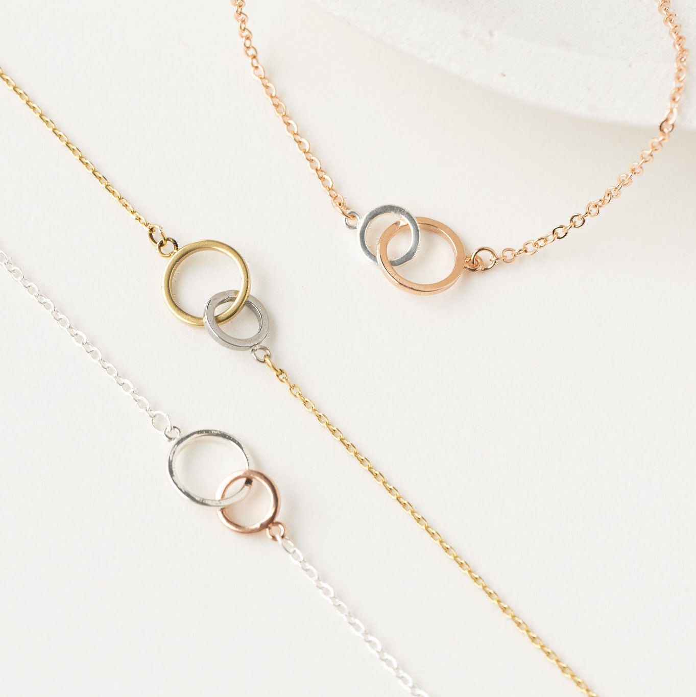 Bracelet minimal avec deux cercles entrelacés. Brillant et épuré, parfait pour une élégance discrète au quotidien.