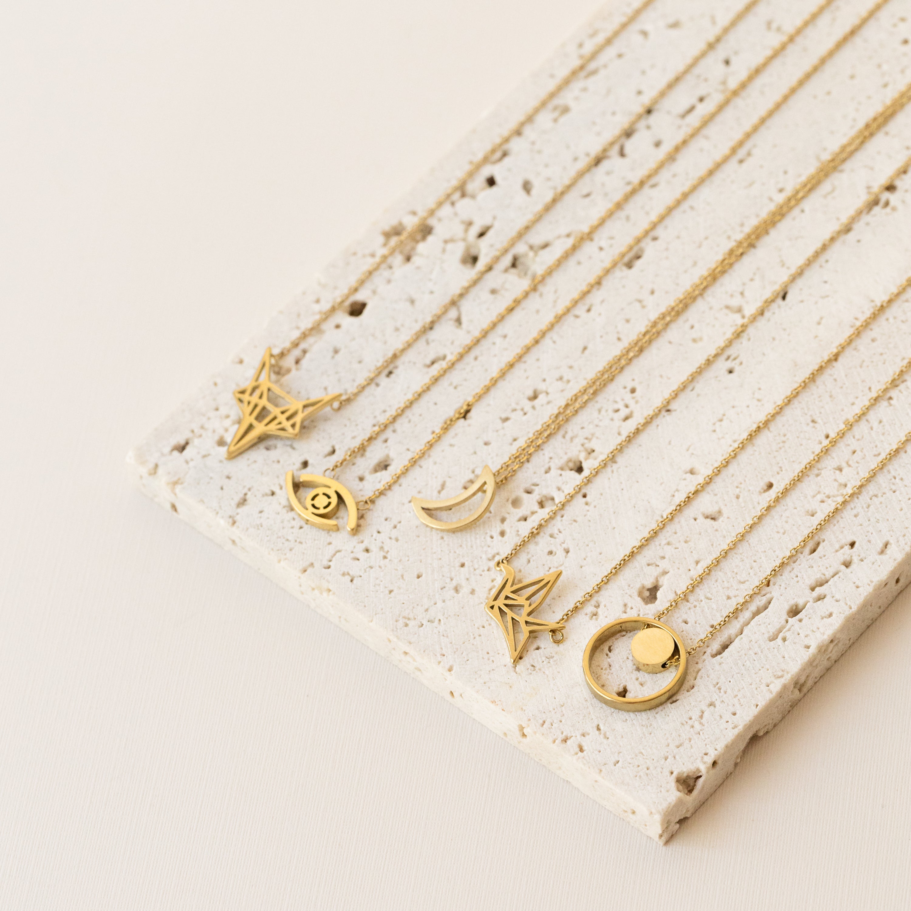 Moon-shaped necklace with a soft brushed finish. Subtle and celestial, it brings a gentle glow to any outfit—perfect on its own or layered.