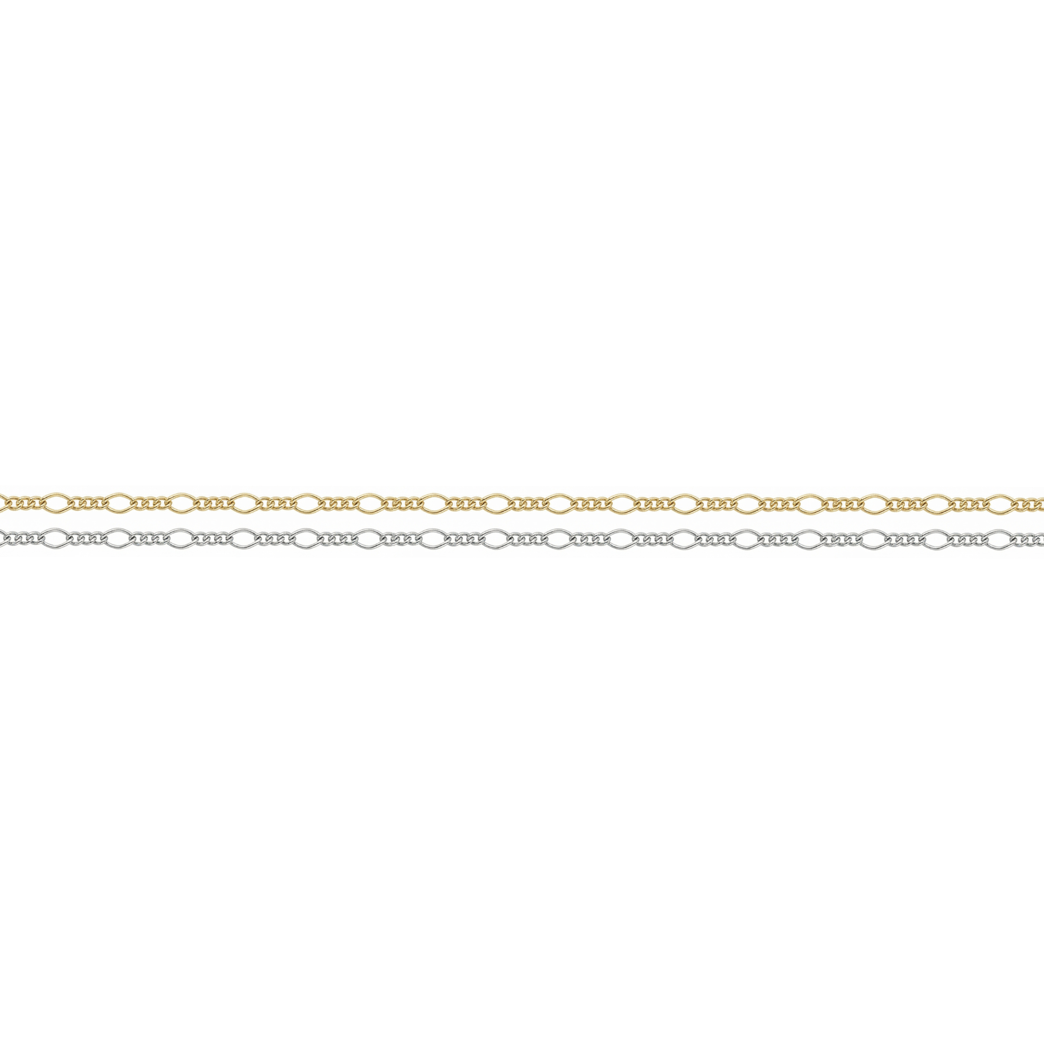 This oval figaro chain is characterized by a repetitive sequence of an elongated oval link followed by smaller circular links.
